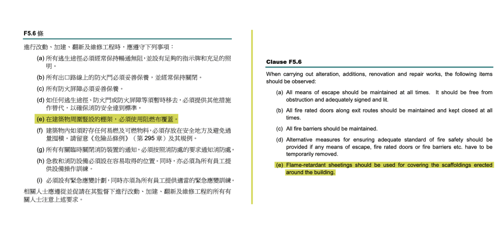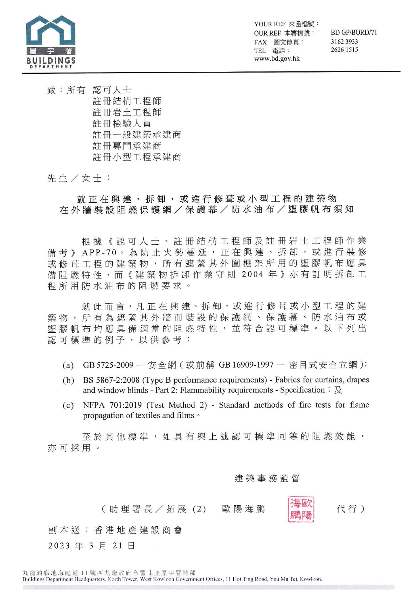 - 屋宇署致認可人士、結構工程師、岩土工程師、註冊檢驗人員通告函件 - 就正在興建、拆卸、改動及加建、修葺或小型工程的建築物在外牆裝設阻燃保護網/保護幕/防水油布/塑膠帆布須知 (2025 年 11 月 27 日) (BD GR/1-50/97) (來源)