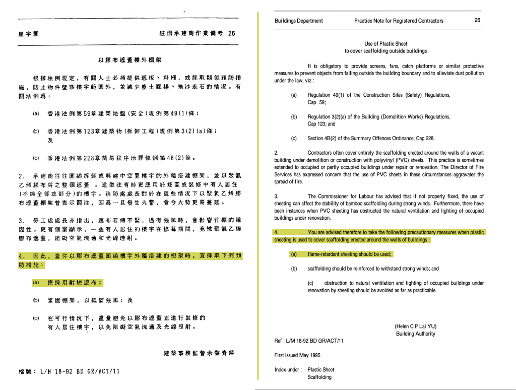 - 屋宇署致一般建築承建商、專門承建商、小型工程承建商通告函件 - 就正在興建、拆卸、改動及加建、修葺或小型工程的建築物在外牆裝設阻燃保護網/保護幕/防水油布/塑膠帆布須知 (2025 年 11 月 27 日) (BD GR/1-50/97) (來源)