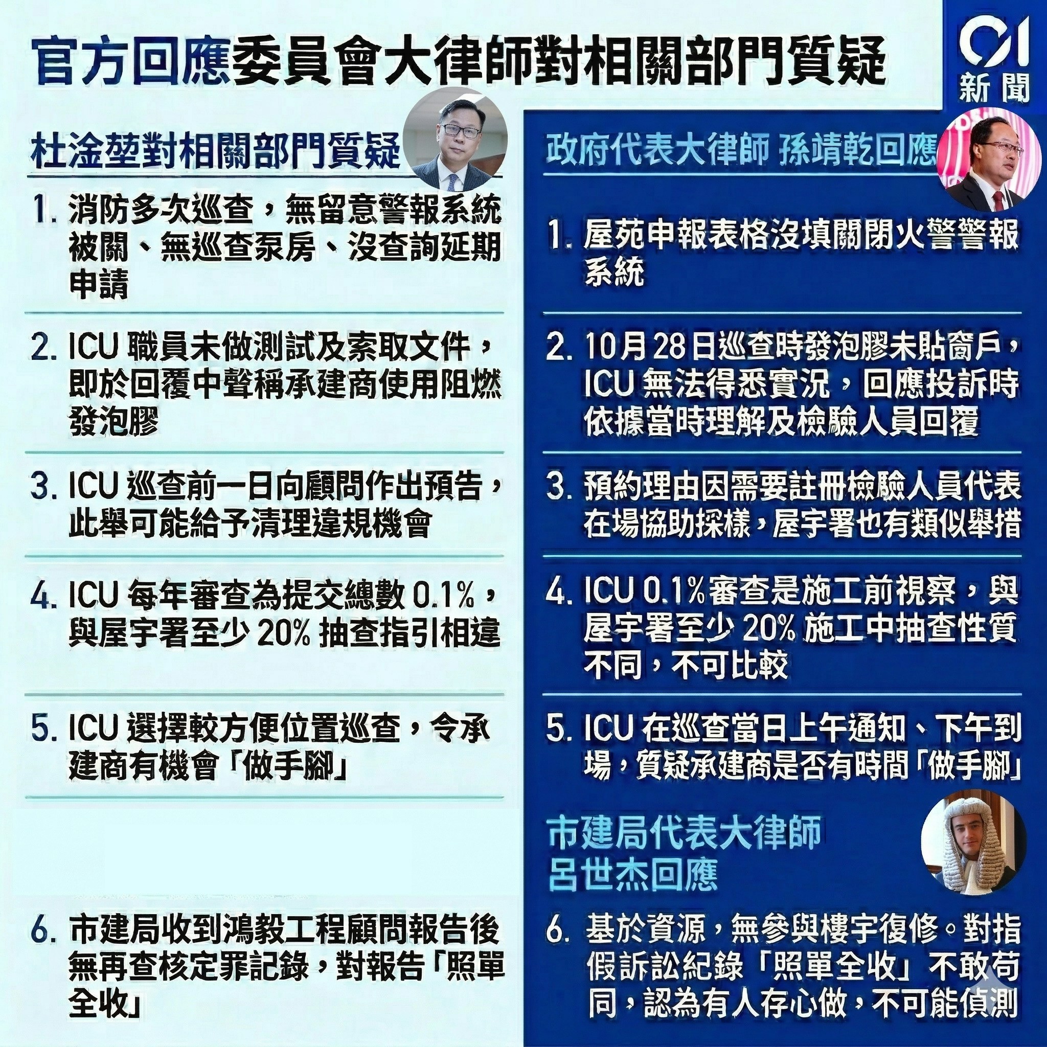 大埔宏福苑火災獨立委員會今日(24日)舉行首輪第三場聽證會,委員會代表大律師杜淦堃在首兩日陳詞中,提出對各部門的質疑。代表相關部門的資深大律師孫靖乾及呂世杰今起開始陳詞,為房屋局獨立審查組(ICU)、消防處及市建局3部門澄清,下文一覽雙方陳詞。