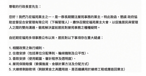 華懋集團旗下合安管理公司(簡稱合安)今年1月6日接任大埔宏福苑管理人,惟至今超過兩個月,仍未與宏福苑業主及相關代理人(統稱業主)有任何溝通或會議,有業主不滿「一直搵唔到人」,周日(15日)聯署去信特首【圖】,要求政府督促合安盡快召開業主大會,解答居民的疑問,截至昨天聯署名單已逾400名,佔總數兩成。 ...