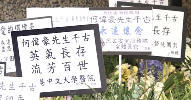 殯儀館外擺放了社會各界致送的花牌,包括他生前駐守的沙田消防局、民安隊、聖約翰救傷隊、中大醫學院等;亦有來自政界和政府部門。牆上則貼滿心意卡、繪畫、信件,向何偉豪表達敬意。