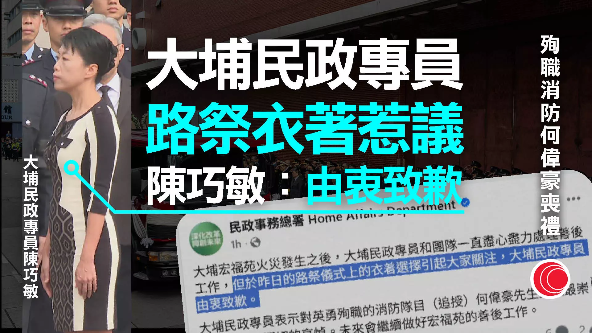 宏福苑大火|獨立委員會到災場視察 有線新聞 2025年12月23日 分享 分享此新聞 選擇分享平台 或複製鏈結 複製鏈結 To view this video please enable JavaScript, and consider upgrading to a web browser that supports HTML5 video 【有線新聞】大埔宏福苑大火,獨立委員會到災場視察。 獨立委員會主席陸啟康及兩名成員陳健波及歐陽伯權聽取人員講解災場情況,了解火災成因、大廈消防設備、樓宇維修物料及施工安全等,再由身穿白色保護衣的人員陪同到災場實地視察。委員會已開展工作,要查明大火起因,以及其他制度問題。他們在宏福苑逗留約3小時,之後坐車離開。委員會須在9個月內完成調查,並向行政長官提交報告。